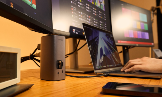 实现笔记本电脑多屏扩展, 是我选购这款绿联12合1立式多功能扩展坞的动机之一。而熟悉处理器平台的朋友就知道,苹果m系列芯片虽然性能强大,但对于多屏扩展的支持比较一般,至多只可以扩展一台外接显示器。而这,对于程序员/剪辑师/股票证券交易员等需要多屏协助的从业者来说,显然就不那么方便了。