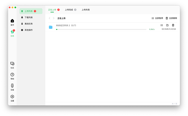 下载速度在9.3mb/s。占用容量为1.04gb的1696个文件,实测完成上传的耗时为2分14秒,相较于没有加速包的情况下传输效率提高了一倍。